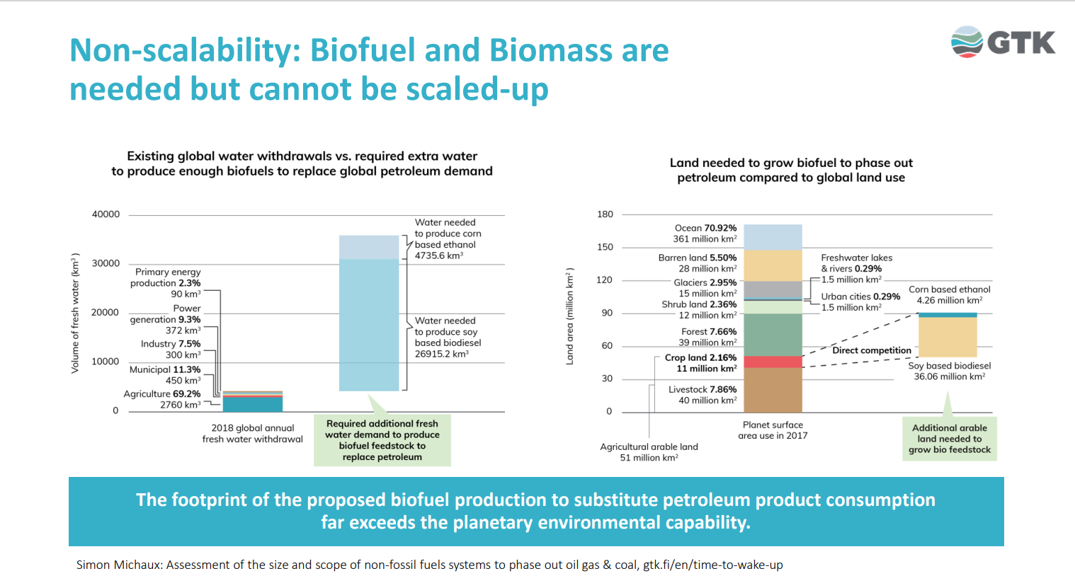 Ein som har gått grundig inn i denne problemstillinga er Simon P. Michaux. Han er professor i geometallurgi ved Geological Survey of Finland og har erfaring innan gruvedrift. Han har berekna kva som skal til for å gjennomføra ei fullstendig energi-transisjon. Arbeidet han har gjort er beskreve i ein rapport på 1000 sider kalla "Assessment of the Extra Capacity Required of Alternative Energy Electrical Power Systems to Completely Replace Fossil Fuels". I rapporten slår Michaux fast at kompleksiteten i utfasinga er grovt undervurdert.