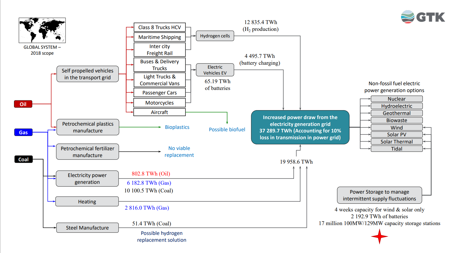 Plansja over syner heile energisystemet og den foreståande transisjonen. Frå denne kan me blant anna sjå at kunstig gjødsel, som nyttar naturgass i produksjonen av hydrogen som saman med nitrogen utgjer bestanddelane i gjødselet, ikkje enkelt kan produserast annleis. Om lag halvparten av jordas befolkning er avhengige av mat produsert ved hjelp av kunstgjødsel. Den unge klimaaktivisten Joachim Skahjem som ville anmelda Equinor for massemord, var nok ikkje klar over dette. Ein umiddelbar global stogg i verdas gassproduksjon vil ta livet av ein vesentleg andel av verdas befolkning. Dette ser det ut til at mange klima-aktivistar ikkje kjenner til. Ein produserer ikkje olje og gass avdi det er så smart, ein har rett ut sagt ikkje noko anna val.