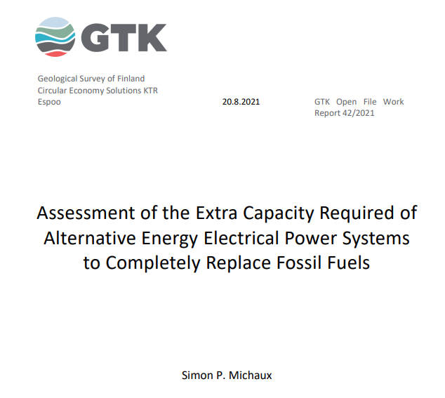 Ein som har gått grundig inn i denne problemstillinga er Simon P. Michaux. Han er professor i geometallurgi ved Geological Survey of Finland og har erfaring innan gruvedrift. Han har berekna kva som skal til for å gjennomføra ei fullstendig energi-transisjon. Arbeidet han har gjort er beskreve i ein rapport på 1000 sider kalla "Assessment of the Extra Capacity Required of Alternative Energy Electrical Power Systems to Completely Replace Fossil Fuels". I rapporten slår Michaux fast at kompleksiteten i utfasinga er grovt undervurdert.