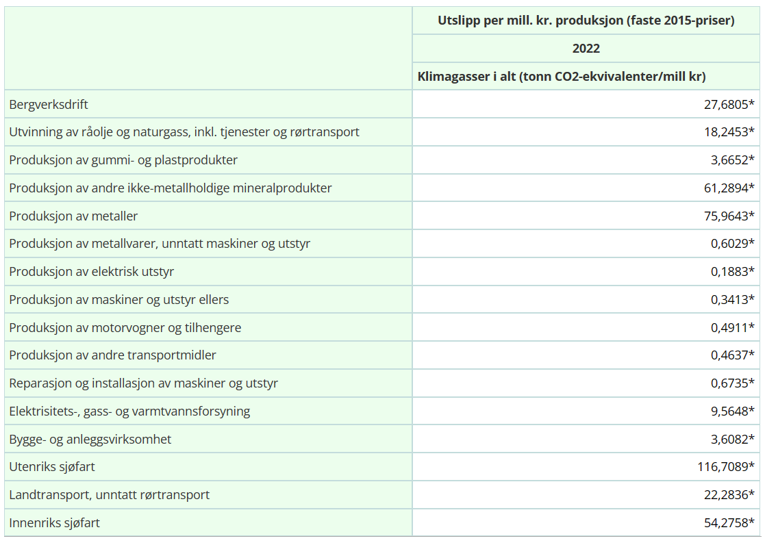 Sjølv om ein investerer for å få ei utsleppsfri verd, er ikkje investeringane utsleppsfrie. Eg har henta ut ein tabell frå SSB. Tabell-oppsettet finn du her. Eg har lagt inn dei næringsverksemdene som er mest relevante for å indusera desse investeringane. Dette er noverande tal så ein må ta høgde for ein lett fallande graf på dette i framtida. Eg gjer det så enkelt at eg tek eit snitt av desse tala og får då eit litt unøyaktig, men illustrerande nøkkeltal på 25 tonn CO²-ekvivalentar pr investert million kroner.